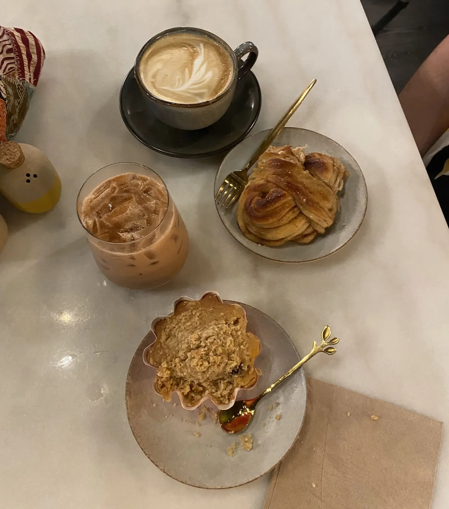 I ordered an iced chai latte with oat milk and a peach crisp kek, while John got a cappuccino and a cardamom knot. Overall, I thought everything was fine. The drinks and pastries were good and satisfying, but they weren't overwhelmingly amazing.